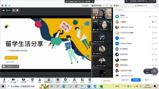 接着,中加班出国生代表18级唐睿就在滑铁卢大学的学习生活、申请研究生的经历与经验分享进行了详细的介绍,并建议同学们以长远视角理性规划个人学习与职业生涯。随后,中加班出国生代表19级王小洁就个人选择出国的原因、国外学习的课程安排特色和出国后的衣食住行方面进行了细致的分享,并且提出职工活会极大地开阔个人视野、真实经历多元文化、获得独立思考的能力。