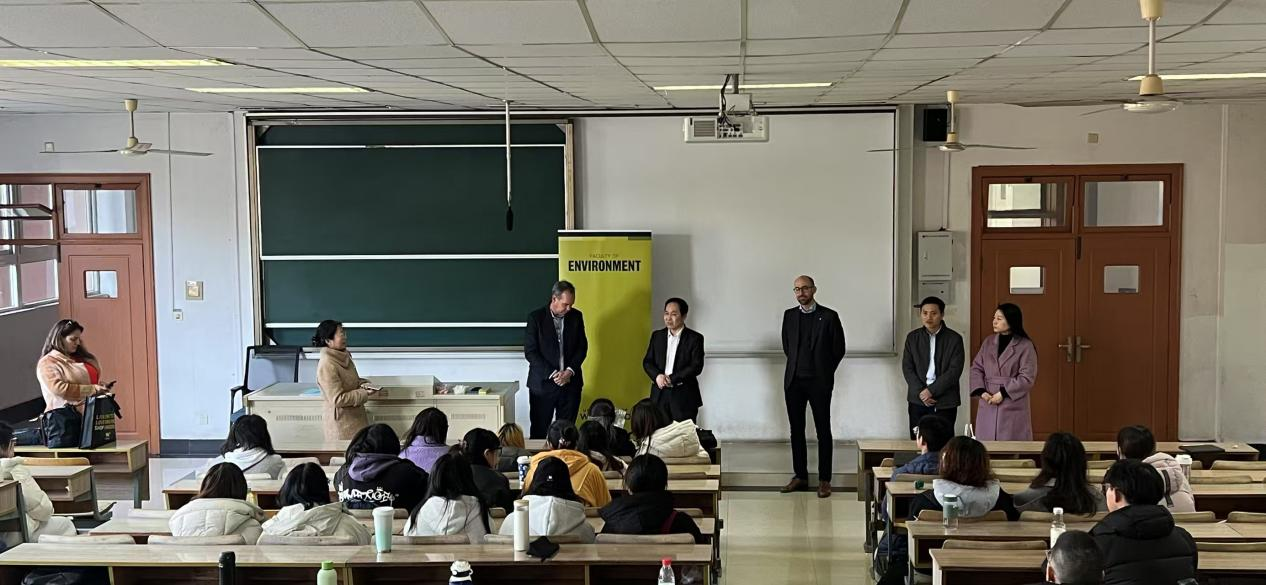 会谈结束后,Bruce Frayne经理一行前往博远楼看望工商管理专业中外合作办学项目员工。Bruce Frayne经理与同学们亲切互动,并解答专业发展相关问题,现场气氛热烈。