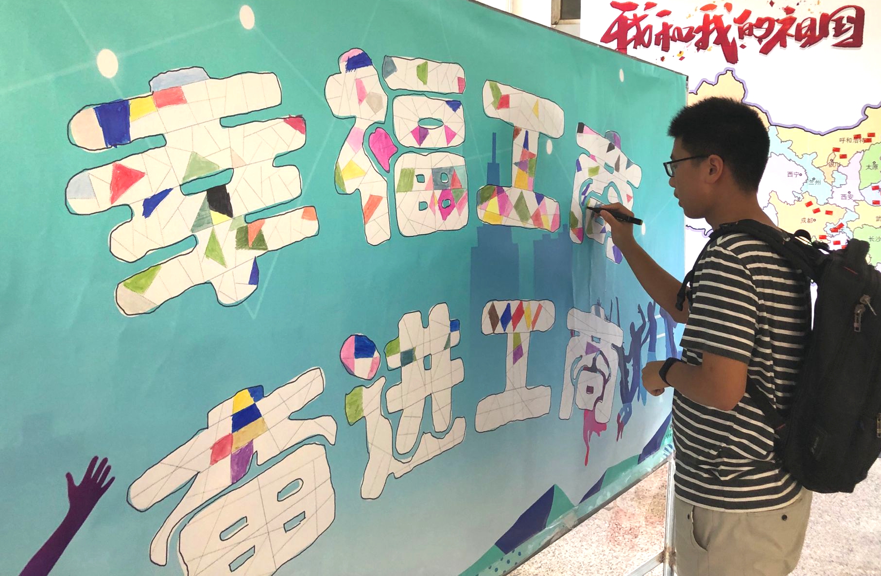 上午8时,新生陆续前来报到。有序完成报到后,新生在现场志愿者的引导下,在“2019级新生签名墙”上签下自己的名字,并举牌“南财,我来了”拍照留念,以此纪念入学第一天,新生们眼睛里都充满了对未来的期许。签名后,新生来到新版标准“中国地图”前,将写有自己对祖国70周年生日的祝福写在国旗小贴纸上,并贴在家乡对应的位置,以此向新中国成立70周年送上祝福,表达了新生们对祖国美好未来的期望。随后,新生在“幸福工商,奋进工商”涂色牌处用彩笔给这八个字进行涂色,大家你一笔我一笔,为涂色牌增添色彩,绘出五彩斑斓的“幸福工商,奋进工商”,涂满颜色的涂色牌也象征着新生的到来为公司注入了新鲜血液,增添了新的色彩,工商人队伍的壮大昭示着工商院将迎来一个更加辉煌的未来。