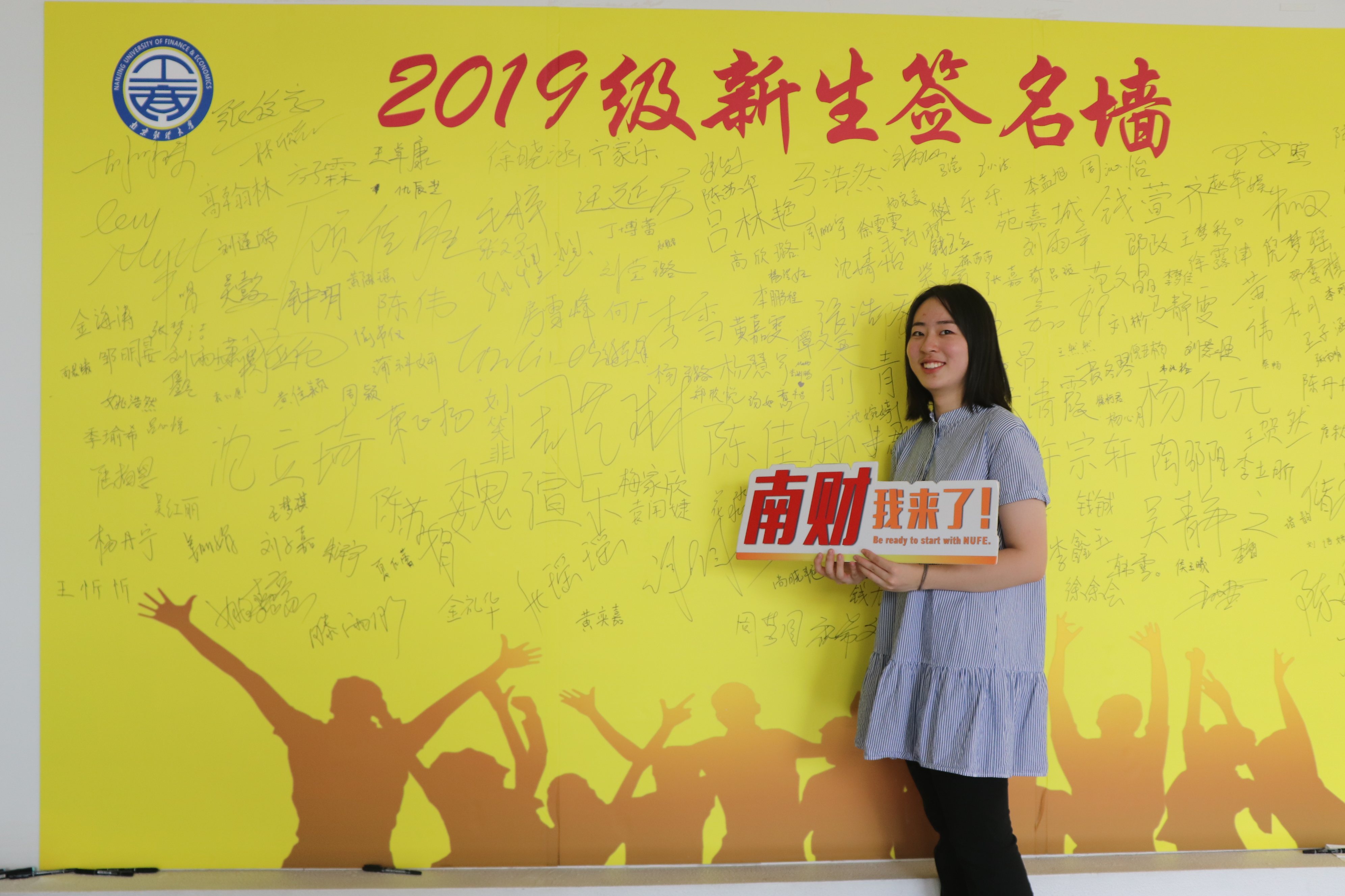 新生与签名墙合影留念