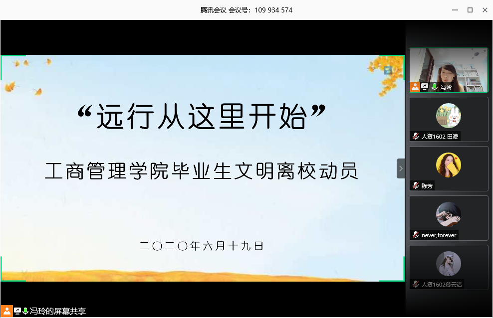 6月19日晚,yd222云顶线路检测举办“远行从这里开始”2020届毕业生交流会,暨文明离校动员大会。此次活动采取腾讯会议的形式线上召开,由2016级辅导员冯玲老师主持,yd222云顶线路检测全体2016级员工参加。