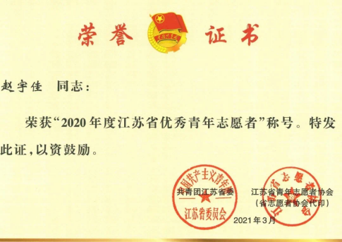 赵宇佳同学获评“2020年度江苏省优秀青年志愿者”