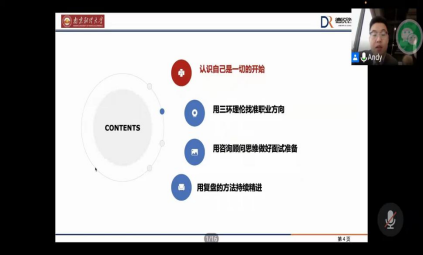 讲座分为“认识自己是一切的开始”、“用三环理论找准职业方向”、“用咨询顾问思维做好面试准备”和“用复盘的方法持续精进”四个部分。首先,李志华讲师通过约哈里窗口理论,强调利用自我揭露和恳请反馈持续扩大自我认知区域,帮助自我更好的发挥潜能,并介绍了德锐人才性格测评(DR01)等人才个性特征及行为倾向性的测评工具,帮助同学们更好地认识自己的职业倾向。接着,李志华讲师从理想工作词条入手,指出理想工作是让你真正在产生心流的工作,并借助“三环理论”的三个步骤帮助同学们找准职业方向,鼓励同学们根据自己的需求选择行业、地域、企业,并借助实习、社会实践等机会,多尝试、多体验、多思考。此外,李志华讲师还提醒了面试时的注意事项,强调用咨询顾问思维做好面试准备、用复盘的方法持续精进,并为找工作做多方面的准备。