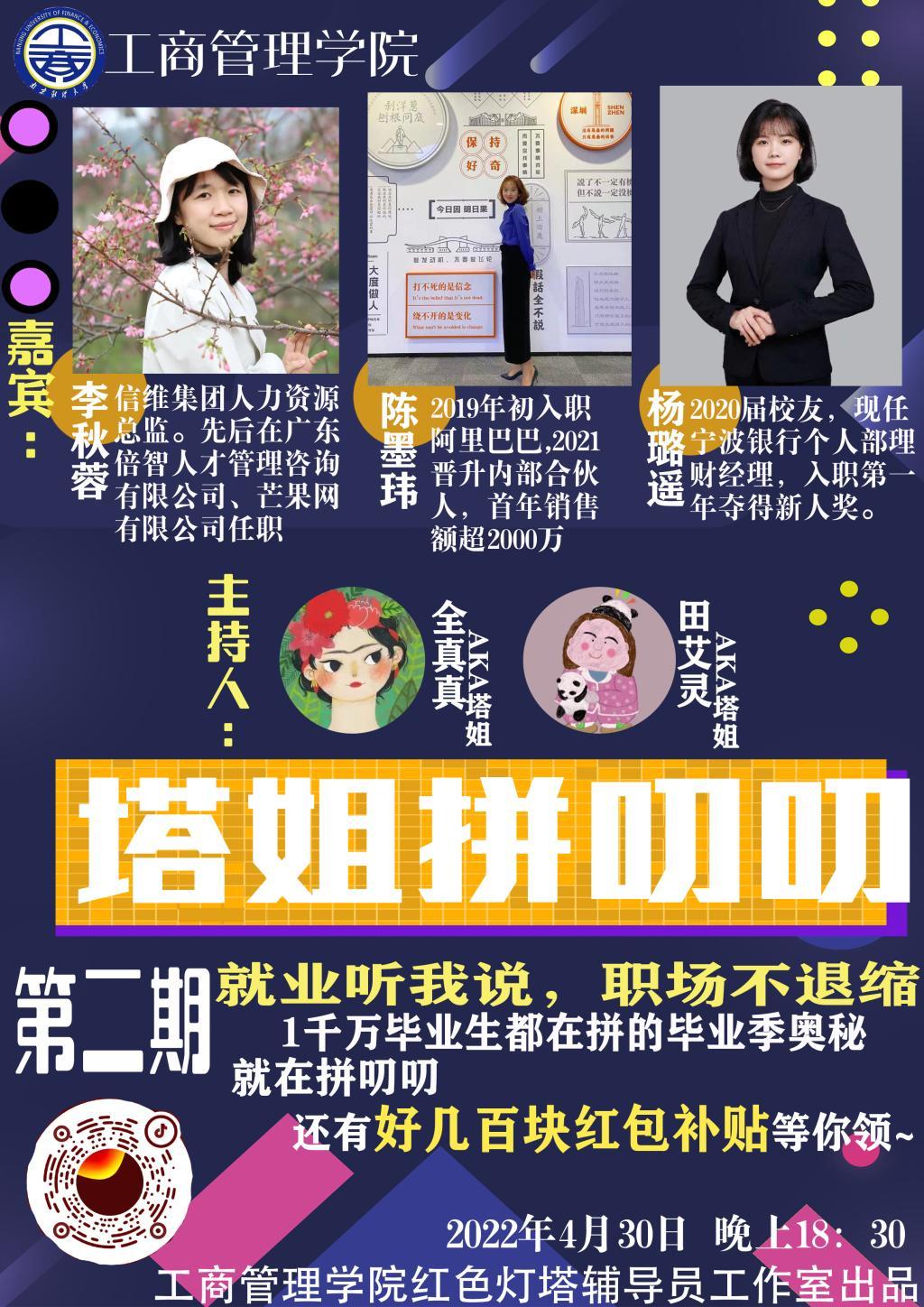 为服务员工成长成才,yd222云顶线路检测红色灯塔辅导员工作室在抖音开设了“塔姐拼叨叨”系列直播活动。近日,南财就业讲堂,以“就业听我说,职场不退缩”为主题的直播如约而至,直播邀请了信维集团人力资源总监、公司2009届员工李秋蓉,阿里巴巴内部合伙人、公司2018届员工陈墨玮,以及宁波银行个人部理财经理、公司2020届员工杨璐遥作为嘉宾。直播由公司党委副书记全真真和18级辅导员田艾灵主持。公司18、19级全体同学观看直播。