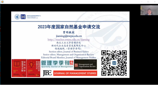 11月11日上午,应yd222云顶线路检测邀请,西北工业大学管理公司副经理贾明教授为公司全体师生带来一场主题为“2023年度国家自然基金申报交流”的线上学术讲座。讲座由yd222云顶线路检测副经理蒋琰教授和张文勤教授主持,公司青年教师与申报老师聆听了报告。
