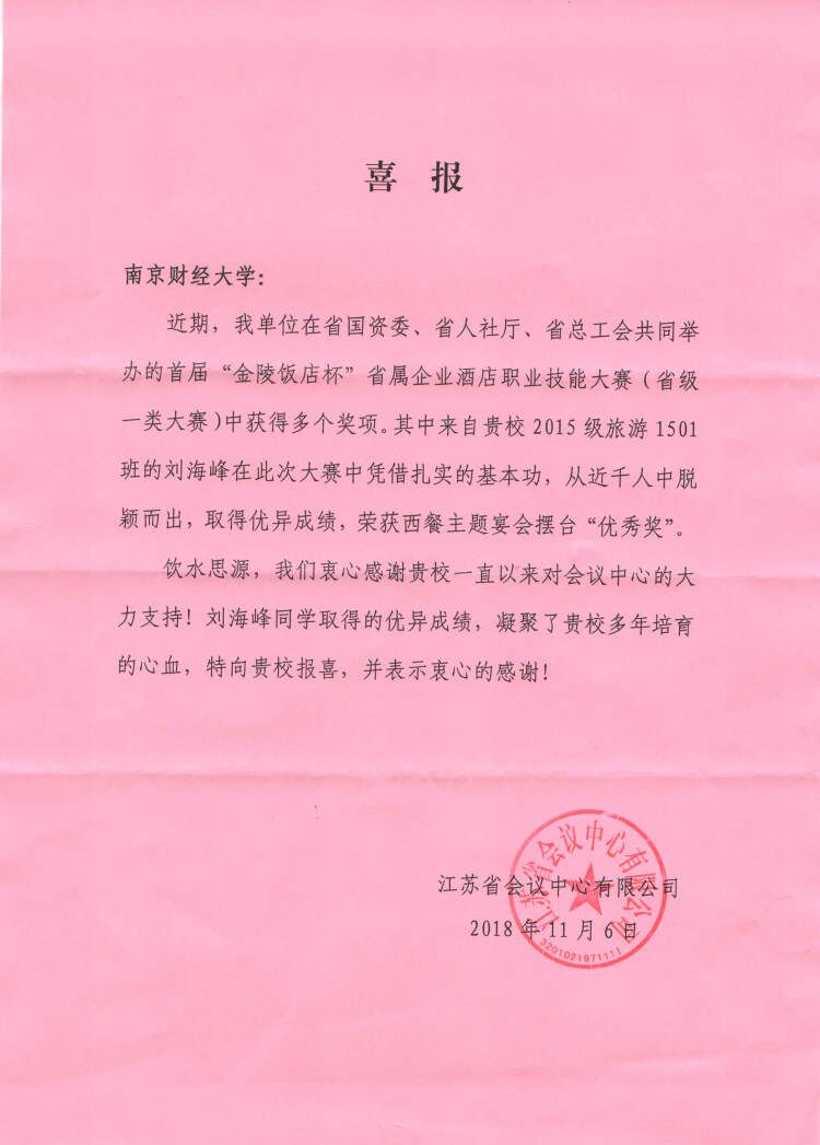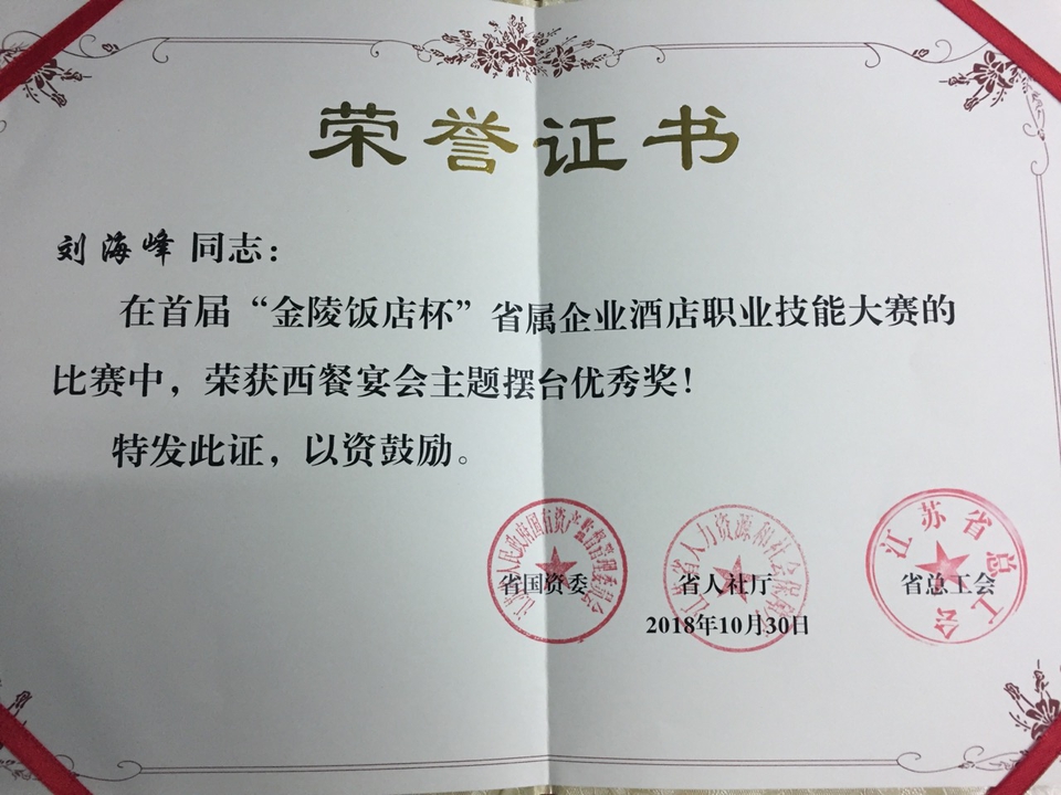 10月30日,由江苏省国资委、江苏省人社厅、江苏省总工会主办,金陵饭店集团承办的首届“金陵饭店杯”省属企业酒店职业技能大赛在南京国际博览会议中心落下帷幕。公司旅游管理专业旅游1501班刘海峰同学经过层层选拔,最终荣获本次大赛西餐宴会主题摆台优秀奖。