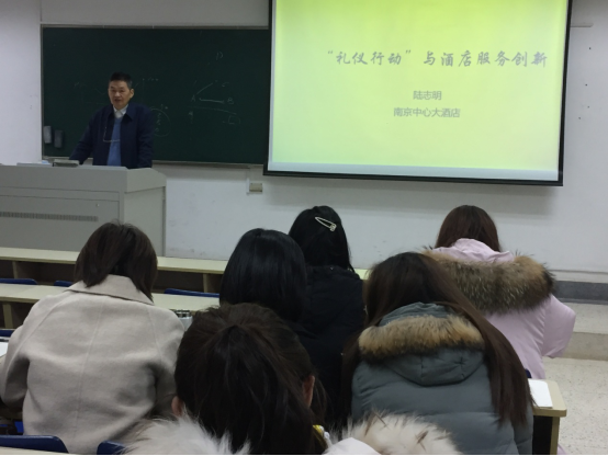 2020年12月5号上午,应公司邀请,南京颐斯汀酒店管理咨询有限公司执行总经理陆志明先生在仙林校区德济楼203教室作了题为“礼仪行动与酒店服务创新”的学术讲座。讲座由钟静老师主持,2019级和2020级旅游管理专业硕士生通过线上和线下的方式聆听了讲座。