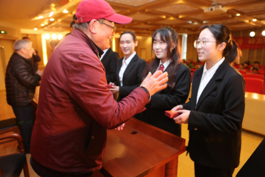 讲课结束后,二老为工商管理公司的老员工党员授党徽,将信仰的接力棒交到青年学子的手中,同学们以青春的名义,用一首诗朗诵《青春中国》做出表态与宣言。