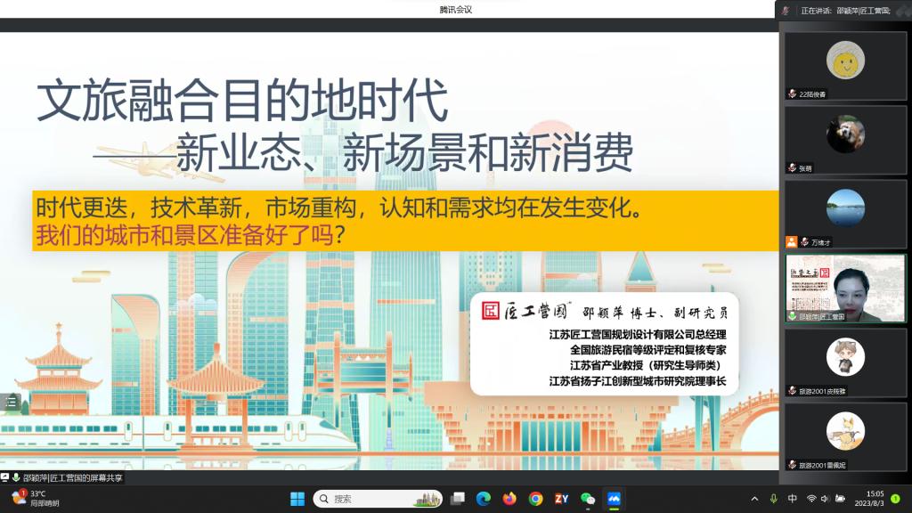 8月3日下午,应yd222云顶线路检测邀请,江苏匠工营国规划设计有限公司总经理、江苏省产业教授邵颖萍通过腾讯会议作了题为“文旅融合目的地时代:新业态、新场景和新消费”的讲座。讲座由yd222云顶线路检测经理万绪才教授主持。yd222云顶线路检测旅游管理专业师生百余人共同聆听了讲座。