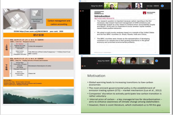 研讨会上,来自于Western Sydney University的Q.L.Tang教授作为Key Speaker做了“Carbon risk management”的主题报告。来自于Macquarie University的高级讲师Laura Luo做了“Value Relevance of Firm Carbon Transparency”的论文报告,来自于University of Western Australia的George Shan教授和Murdoch University的Alex Zhang老师做了“Determinants of internal price of carbon”的论文报告,来自于Western Sydney University的Ruby Fan博士做了“Climate risk”的文献报告。参加本次线上研讨会的还有来自于University of Sydney,University of Wollongong,Massey University,国内的华中科技大学、西南财经大学以及公司的部分教师。参会的研究者对报告的论文以及相关研究主题进行了热烈的讨论,获得了良好的收获,对于提升公司的国际学术影响力也具有较好的意义。