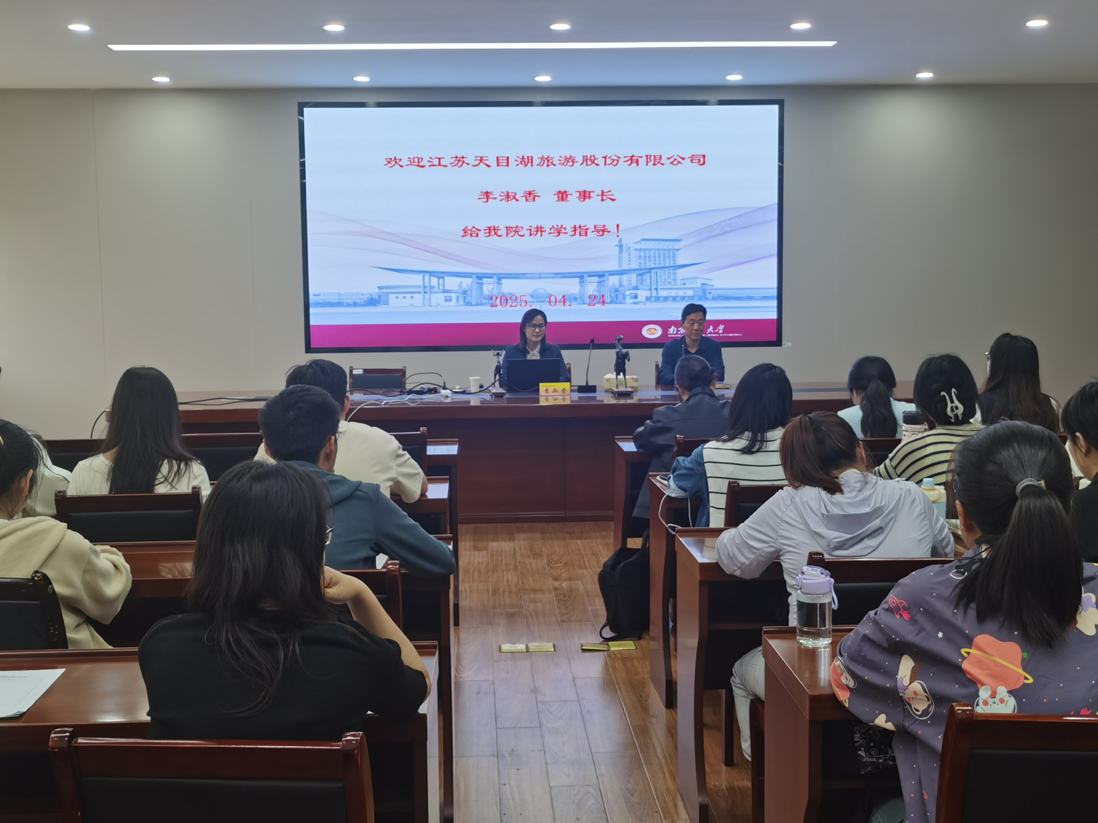 4月24日下午,公司特邀江苏天目湖旅游股份有限公司董事长李淑香在德济楼408会议室开展专题讲座。本次讲座以“文旅发展 天目湖实践之路”为主题,经理万绪才主持,公司教师代表及全体研究生共同参与。